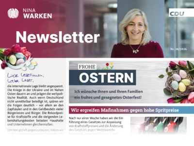 Regelmäßig informiert Nina Warken MdB mit ihrem Newsletter aus dem Wahlkreis und aus Berlin. In der 36. Ausgabe im April 2026 sind auf vier Seiten viele spannende Themen zu finden:
