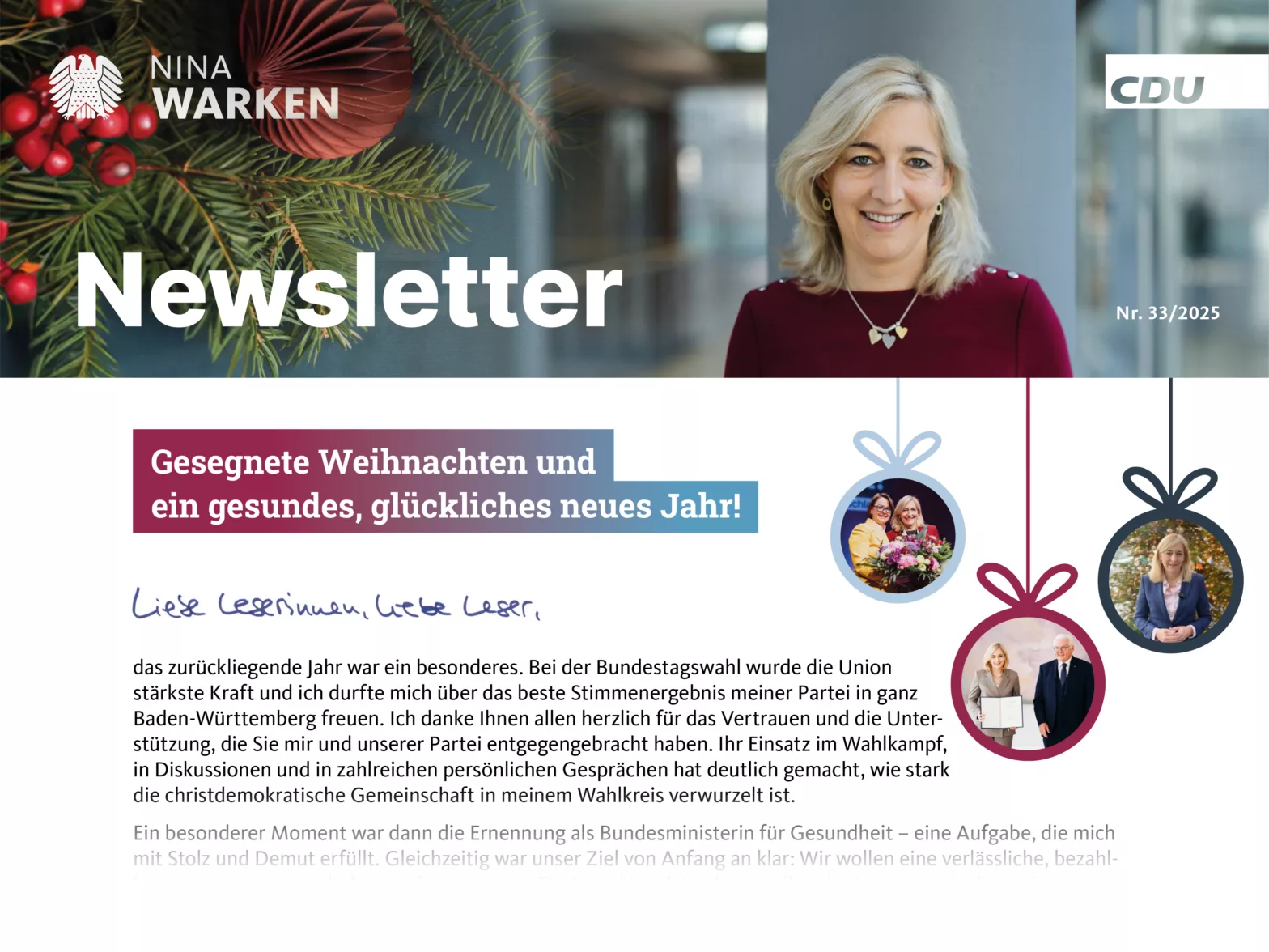 Regelmäßig informiert Nina Warken MdB mit ihrem Newsletter aus dem Wahlkreis und aus Berlin. In der 33. Ausgabe im Dezember 2025 sind auf drei Seiten viele spannende Themen zu finden: